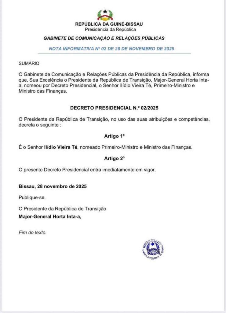 Home ACTUALITÉS Guinée Bissau : le directeur de campagne de Embalo nommé Premier ministre ACTUALITÉSINTERNATIONAL Guinée Bissau : le directeur de campagne de Embalo nommé Premier ministre By contact@senefil.com - 28 novembre 2025 131 0 Facebook Twitter Google+ Pinterest WhatsApp