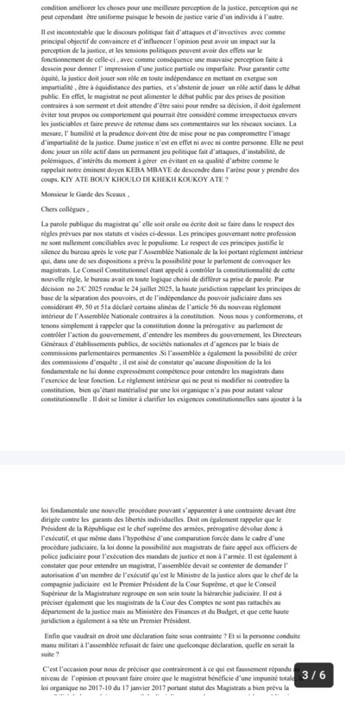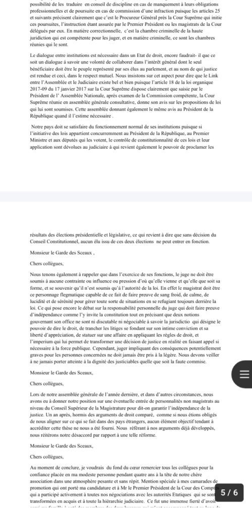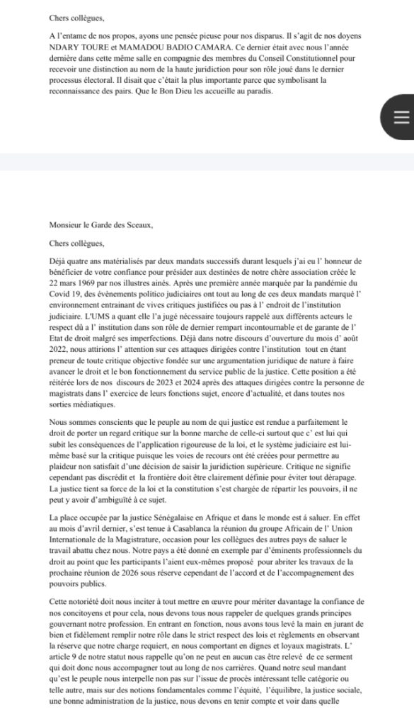 Les magistrats par la voix du président sortant de l’Ums ont profité de leur assemblée générale pour soulever plusieurs points qui leur tient à cœur. Il s’agit notamment de l’indépendance de la justice. Ainsi, la tentative avortée de l’assemblée nationale de les auditionner a été mal perçue. De même, ils dénoncent la possibilité pour des personnes étrangères à leur corps de siéger au conseil supérieur de la magistrature. Un discours poignant d’Ousmane Chimère Diouf devant le garde des sceaux.