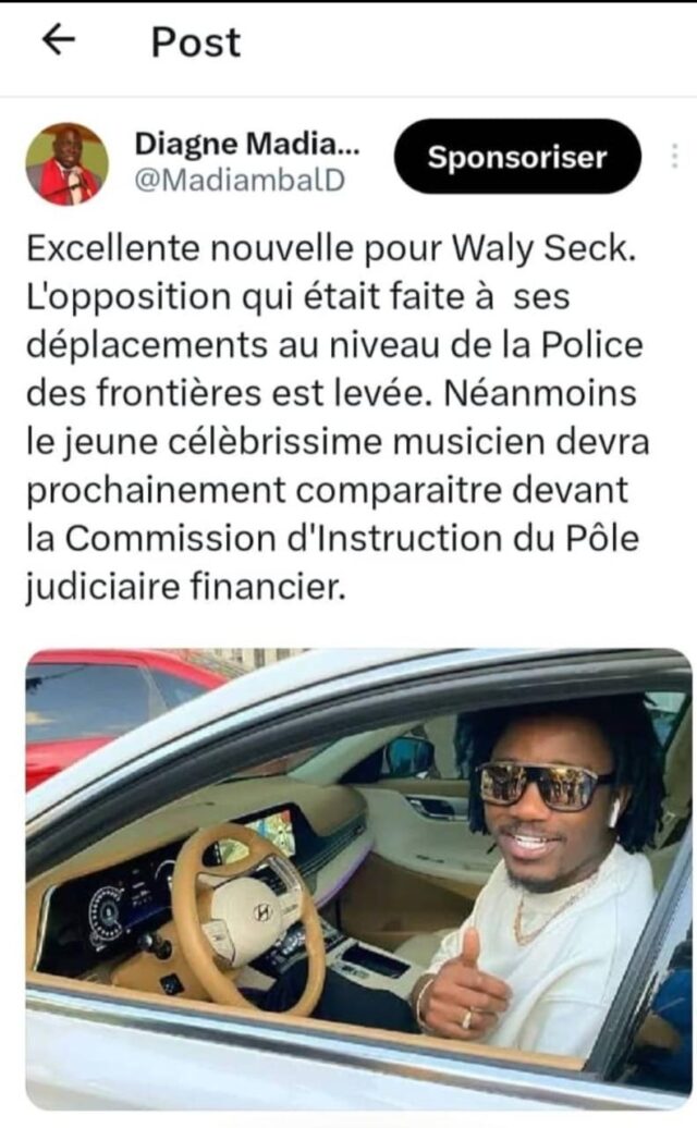 Wally Seck est maintenant libre de quitter le pays. C’est ce qu’a révélé le journaliste Madiambal Diagne. Ce dernier précise tout de même que l’artiste devra se mettre à la disposition du Pool judiciaire financier dans le cadre de l’enquête ouverte contre lui.
