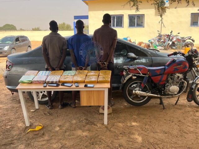 Dans la mise en œuvre du plan de lutte contre le trafic de stupéfiants, la Brigade Territoriale d’Aéré Lao a réussi à démanteler un réseau de trafic de chanvre indien dans la journée du 26 janvier 2026 aux environs de 05 heures.En effet, au cours d’un contrôle, les gendarmes ont appréhendé trois (03) individus, tous de nationalité sénégalaise, à bord d’un véhicule de marque Peugeot 407. A bord du véhicule sur le siège passager avant, étaient dissimulés, dans un sac d’aliments de bétail, quatorze (14) paquets contenant chacun un (01) kilogramme de chanvre indien.La drogue à été saisie avec le véhicule de marque Peugeot 407 ainsi qu’une (01) moto de marque Haojue.La Gendarmerie nationale rappelle que son Centre d’Appel est gratuitement joignable aux numéros 123 et 800 00 20 20 pour tout renseignement utile.