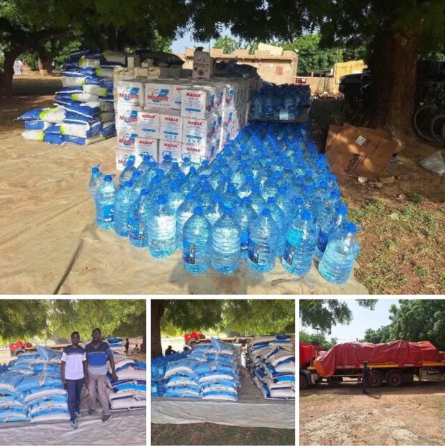 un important lot de denrées alimentaires et de produits de première nécessité est en cours de distribution. L’aide comprend notamment 10 tonnes de riz, 2 000 litres d’huile, 400 grosses de sucre, 40 sacs de lait, ainsi que des produits d’hygiène tels que 67 paquets de savon et 42 paquets d’eau de Javel. En complément, 300 bouteilles d’eau ont été fournies.