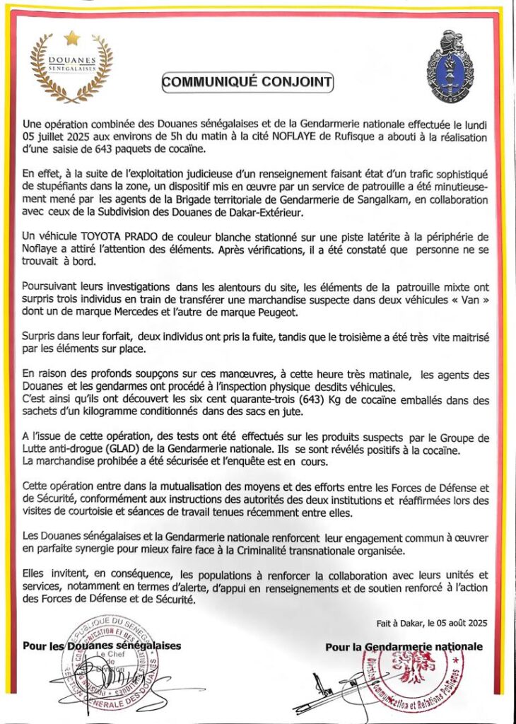 Home ACTUALITÉS Opération conjointe : plus de 600 paquets de cocaïne saisis par la... ACTUALITÉSLA UNECULTURESOCIETÉS Opération conjointe : plus de 600 paquets de cocaïne saisis par la douane et la gendarmerie By contact@senefil.com - 5 août 2025 340 0 Facebook Twitter Google+ Pinterest WhatsApp