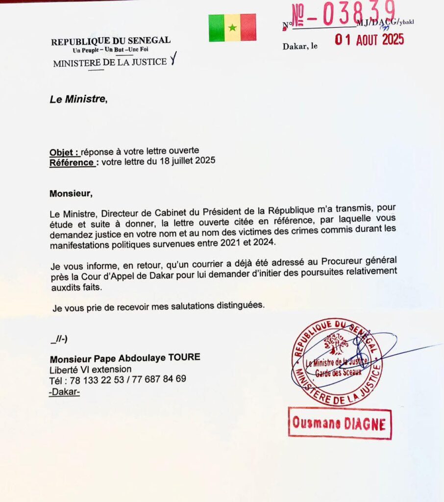 Pape Abdoulaye Touré n’en démord pas. Il réclame toujours justice pour les victimes des crimes commis durant les manifestations politiques survenues entre 2021 et 2024. C’est dans ce cadre qu’il a adressé une lettre ouverte au ministre de la justice. Laquelle a été transmise à Ousmane Diagne par le directeur de cabinet du président de la République au garde des sceaux. Ce dernier a dit avoir saisi le procureur de la République sur la question pour lui demander d’engager des poursuites.