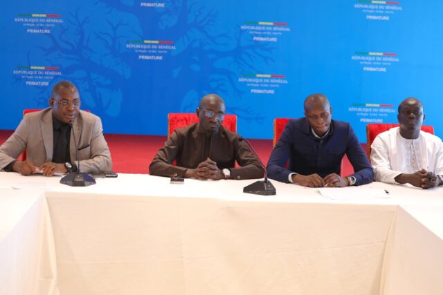 Olivier BOUCAL Ministre de la Fonction et de la Réforme du Service public a procédé au nom du Gouvernement à la signature du protocole d’accord avec le Syndicat des travailleurs de la justice (SYSJUST) et l’Union nationale des travailleurs de la justice (UNTJ), le jeudi 7 août 2025 à la Primature. Cet accord fait suite à plusieurs concessions de part et d’autres a précisé M.BOUCAL. Il a profité de l’occasion pour féliciter la partie syndicale et s’est engagé à privilégier le dialogue pour l’apaisement du climat social. Le Secrétaire de l’UNTJ, Abdoulaye MBOUP qui a fait office de porte-parole a demandé au Gouvernement de ne pas rompre le fil du dialogue et de respecter les points compris dans l’accord. Il a félicité le Ministre BOUCAL et l’encourage à continuer dans la dynamique du dialogue pour un climat social apaisé.Ce protocole met fin à 45 jours de mouvement d’humeur de l’entente SYSJUST -UNTJ.